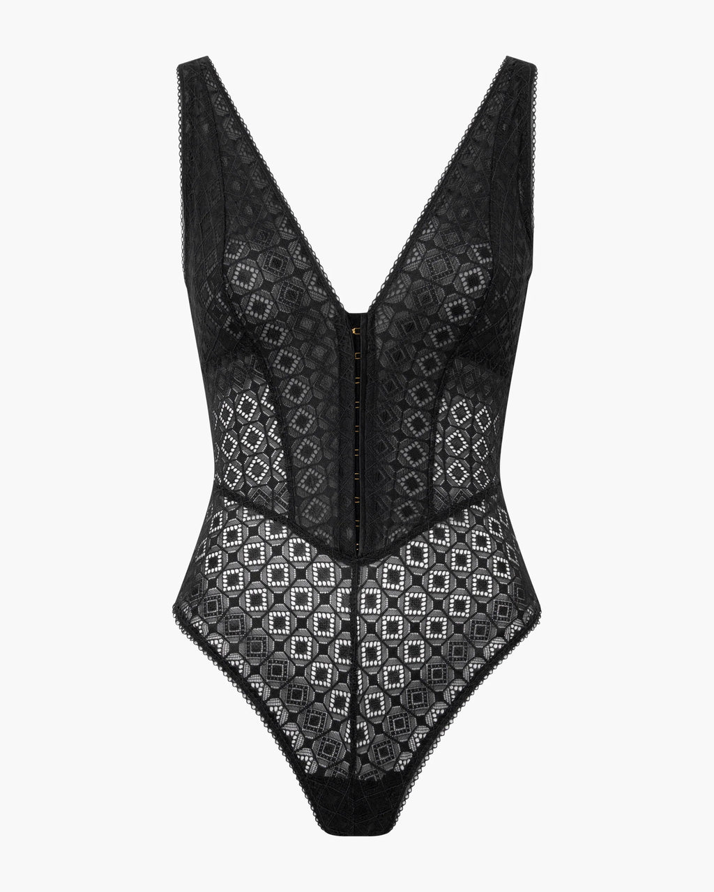 - Wireless bodysuit style featuring a deep V-shaped neckline.