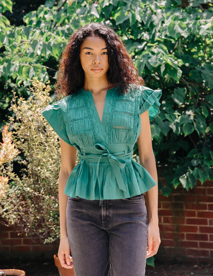 The Madelyn Top in Foliage Green is filled with intricate details of gathers, pintucks, and lace trim. Finished with flutter sleeves and a peplum hem for a cinched yet feminine silhouette.