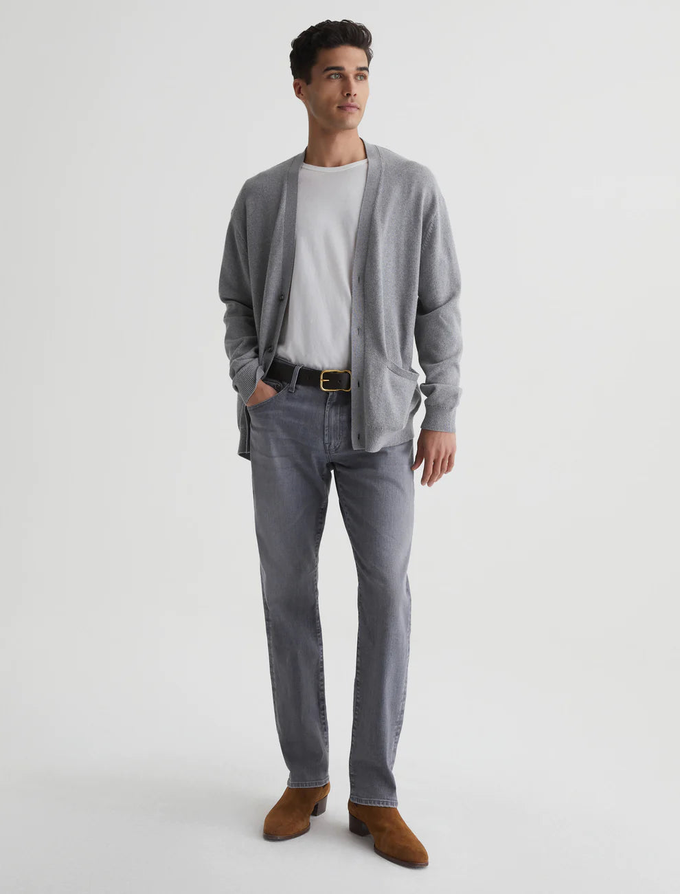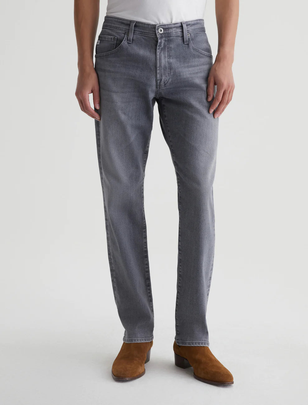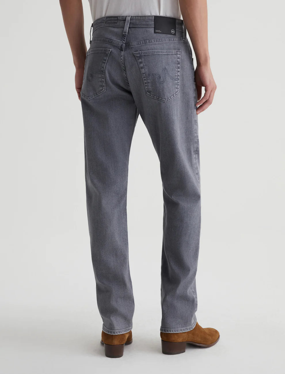 Our Graduate tailored-leg jeans for men, updated here in 10 oz. Ashen Stretch Denim with a faded grey shade. The five-pocket style has a slim mid-rise waist and a relaxed fit from hip to knee before tapering at the leg opening. Our AG Vapor Wash™ process significantly reduces the use of water, chemicals, and energy to lessen environmental impact. Finished with a vegan and 100% biodegradable cellulose patch at the back waistband.