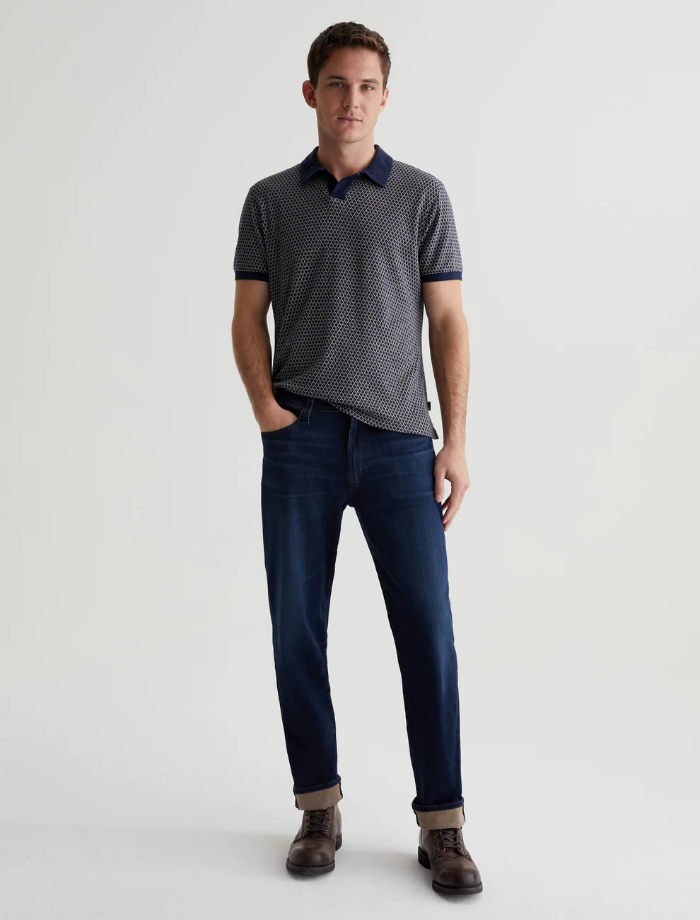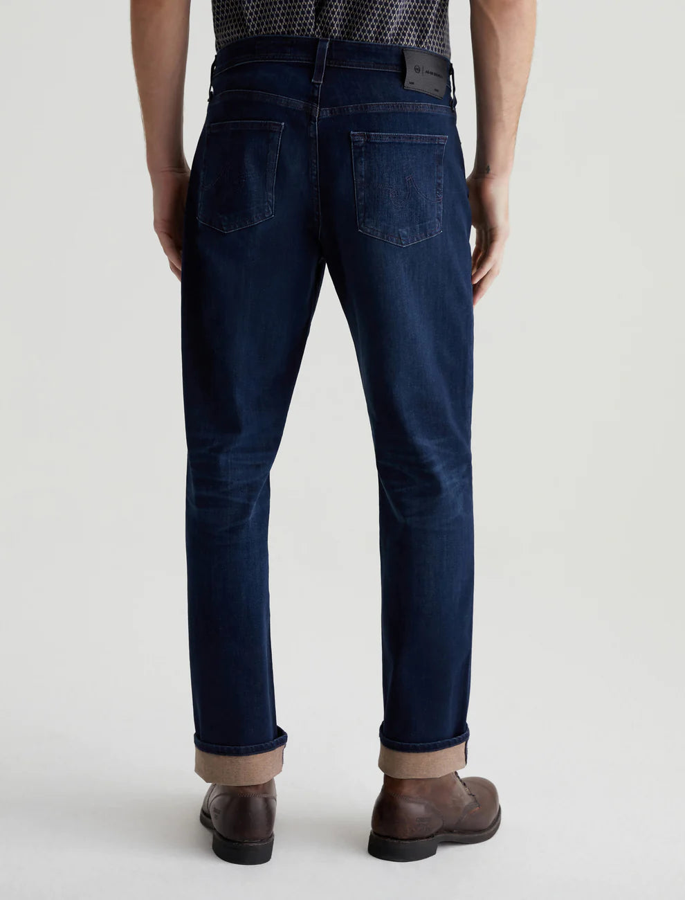 Kace is a straight-leg silhouette, updated here with a cropped inseam and an AG-ed™ dark blue wash. Anchored by a mid-rise waist, the style has a relaxed fit from hip to the knee before tapering at a cuffed leg opening. These 5-pocket men's jeans are cut from 9.5 oz. Infinite Bi-Stretch Denim featuring dual-elastic 360° construction for elevated comfort.