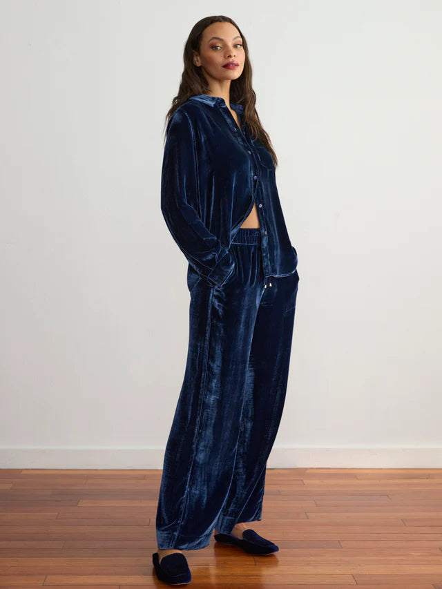 Celebrate in style with the return of our best-selling Velvet Button-Down Shirt. Crafted from a sumptuous viscose-silk blend, this top is endlessly soft against the skin, pairing the plush richness of velvet with the silky smoothness of silk. Perfect for festive soirées or casual gatherings, its luminous sheen and rich color make it a true wardrobe essential. Thoughtfully designed for both comfort and refinement, the shirt features a single pocket, classic button-down styling, and a tailored fit that flatters your silhouette. Long sleeveButton-downSilky-velvet softLuminous sheenSize & Fit:Model (5’9”) wears a size smallLength: 26"Chest: 21 1/4"Sleeve: 23 1/4"*Measurements are taken flatFit: Relaxed; size down if you prefer a more fitted look