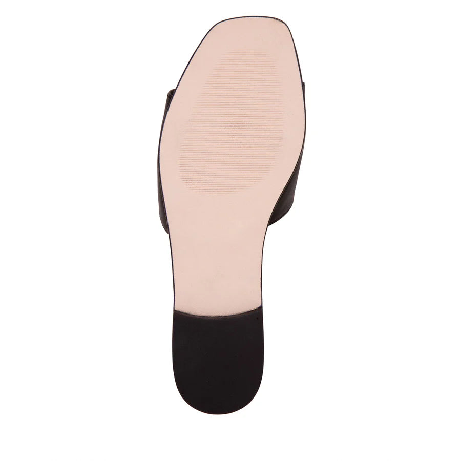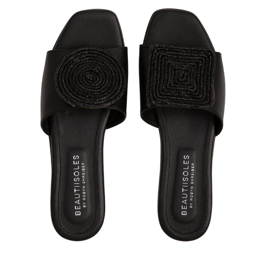 Fashion-forward flat sandal with two contrasting shiny metallic mesh accents on each shoe. One square and one circle. The slide is crafted in soft leather and features a cushioned insole for comfort and a non-marking leather outsole.