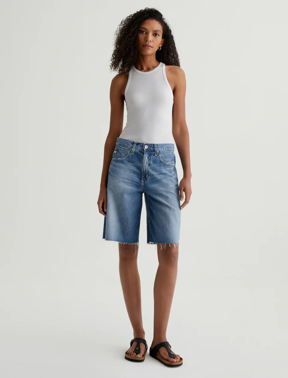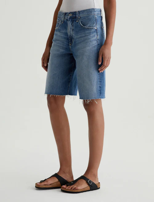 Inspired by our full-length Hattie barrel fit, the Hattie Short has a relaxed high-rise silhouette with side-seam paneling and raw hems that skim just above the knee. This pair comes in 100% cotton Legion Denim from Japan and features a faded medium-blue wash with worn pocket edges.