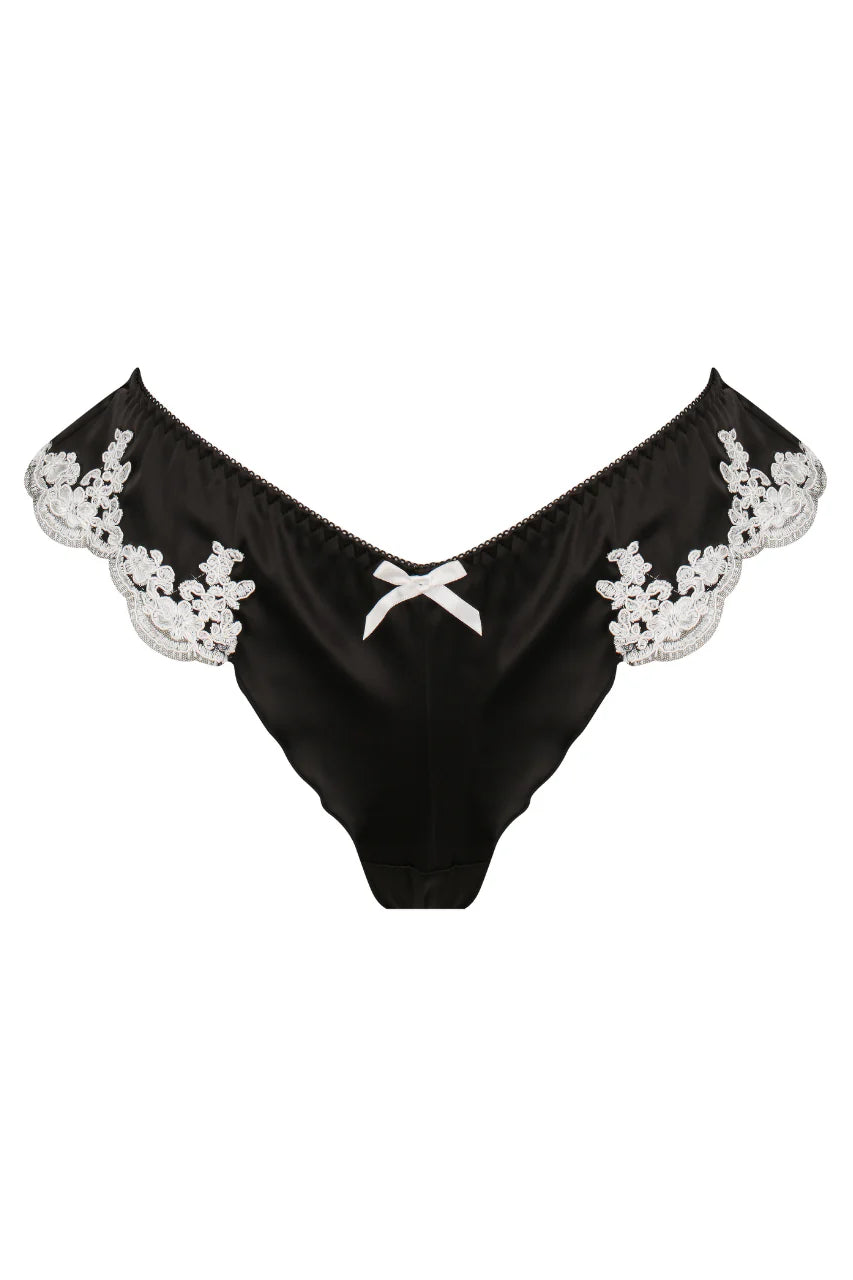 The Jean Knicker in Black captures the timeless romance of vintage lingerie, reimagined in our new soft satin. Detailed with contrasting lace trims, dainty satin bows and delicate gathering, for a flattering silhouette.