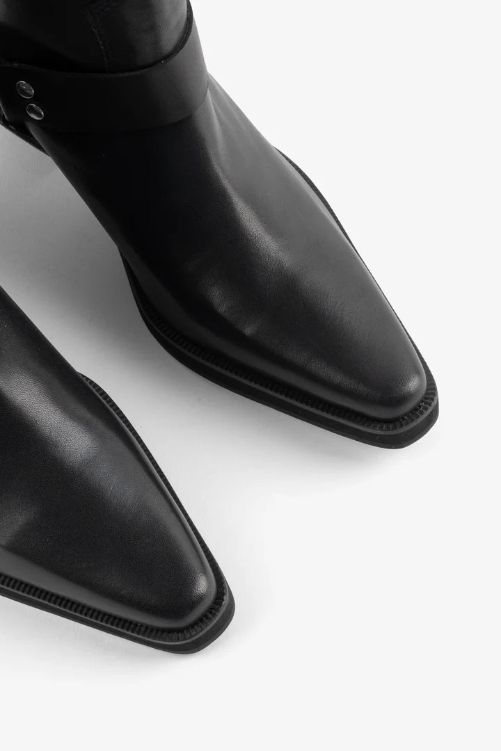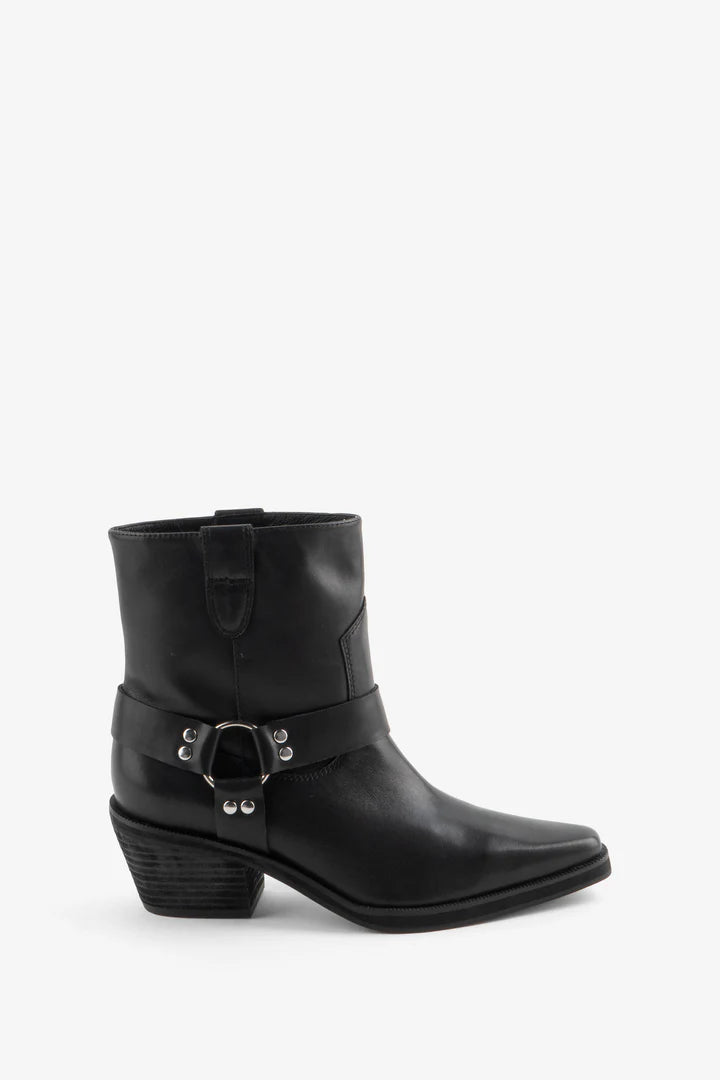Vroom! Vroom! JOEY is a reimagined moto boot with a hint of western flair. This ankle boot is super soft leather with pointed toe and classic harness detail with silver hardware. Your favorite harness moto boot just got a makeover, and we're loving it.