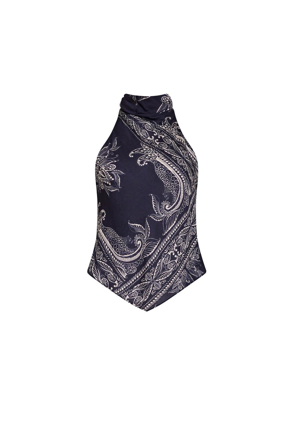 Set the mood in the Arielle Top. This bandana-print halter brings playful energy and charm to any outfit. Complete the set with the matching Arielle Pants and wedge sandals for a vacation-ready look.