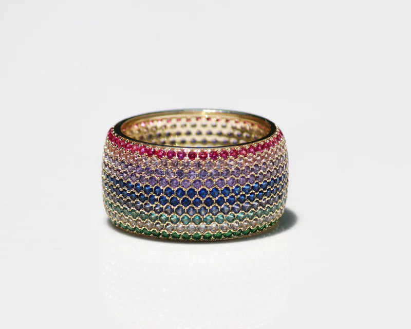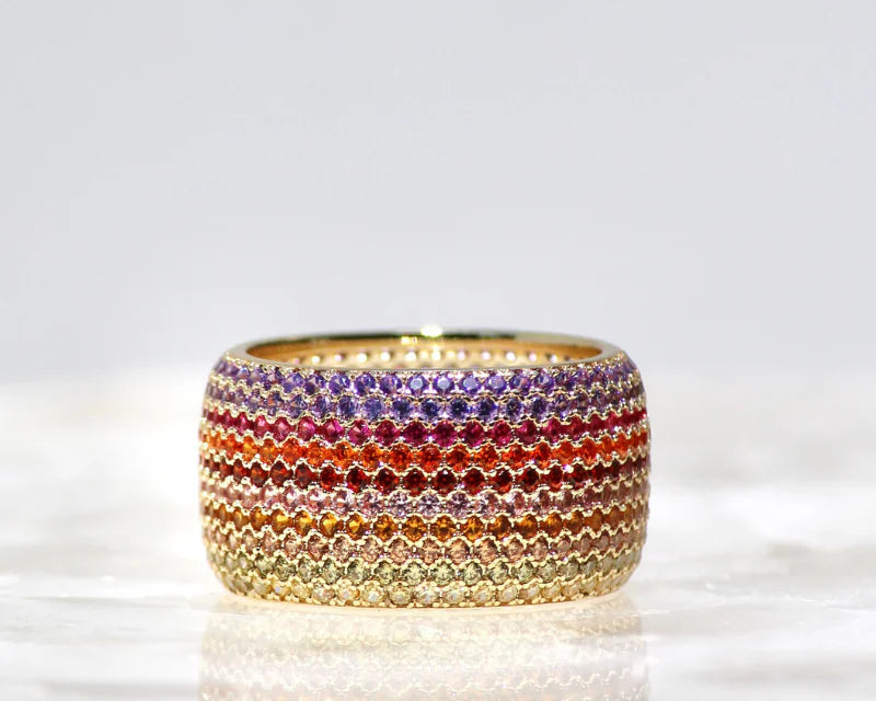 This elegant cigar-style ring is crafted from 14K gold vermeil and adorned with multi-colored blue, green and pink cubic zirconia. Its delicate beauty adds a unique touch to any look.