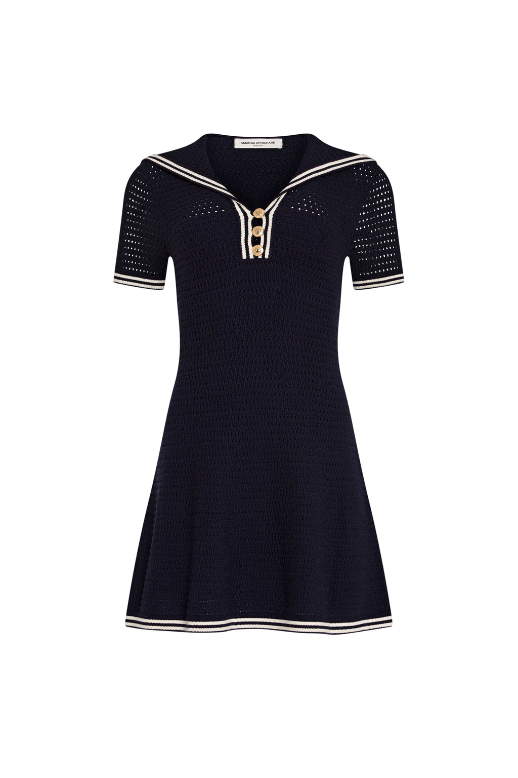 Keep things classic in the Monique Dress. This knit mini features a flattering V neckline and gold buttons for the perfect touch of shine. Pair with ballet flats and minimalist jewelry for a polished, nautical look.