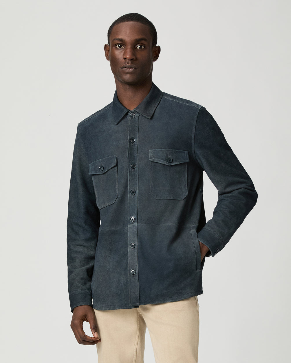 The Peyman Jacket is crafted from 100% buttery goat suede that gives a soft yet durable feel. In a dark navy, this button-up shirt jacket features tonal buttons and double chest pockets. Perfect for layering, this piece is a must-have for transitional weather.