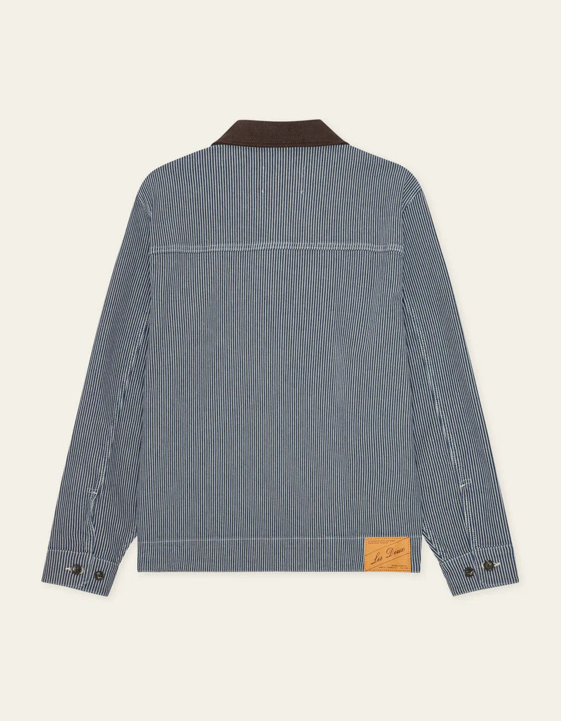 A short striped denim jacket with a clean workwear feel. It features kangaroo pockets, a contrast twill collar and a 2 way zipper for easy layering.