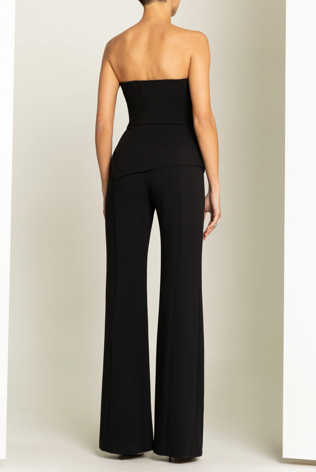The Rockie Jumpsuit is crafted from a stretch super loft woven fabric that molds beautifully to the body while allowing for movement and structure. The strapless bodice is detailed with sunburst tucks for subtle dimension, balanced by an asymmetrical peplum that defines the waist. A straight-leg pant with elongating center front seams completes the silhouette.